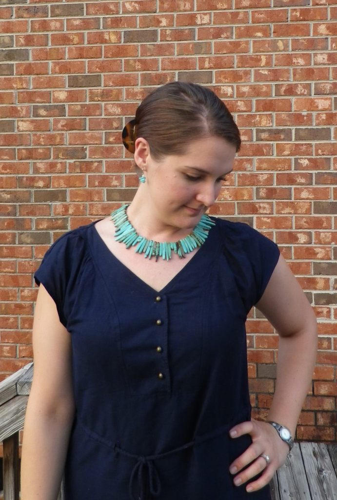 Dress, Magic, TJ MAXX (overdyed by me); sandals, Montego Bay Club, Payless Shoes; leaf earrings and dragonfly necklace, purchased in Cozumel.